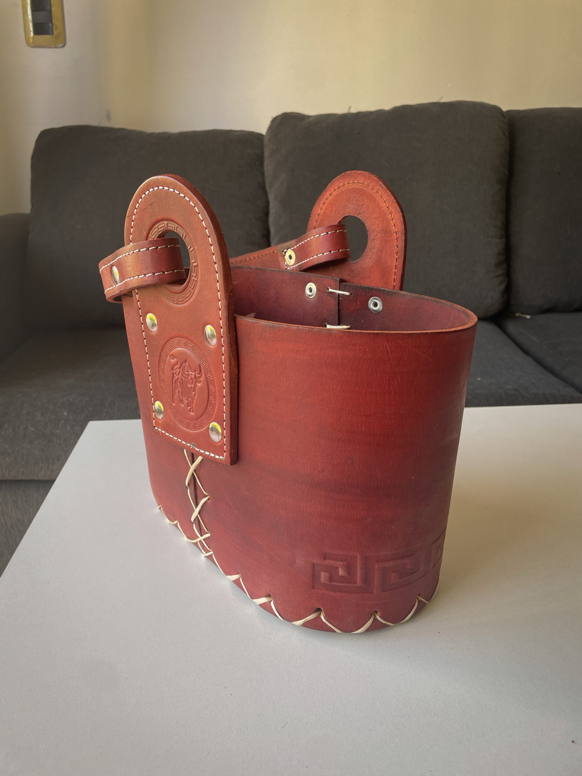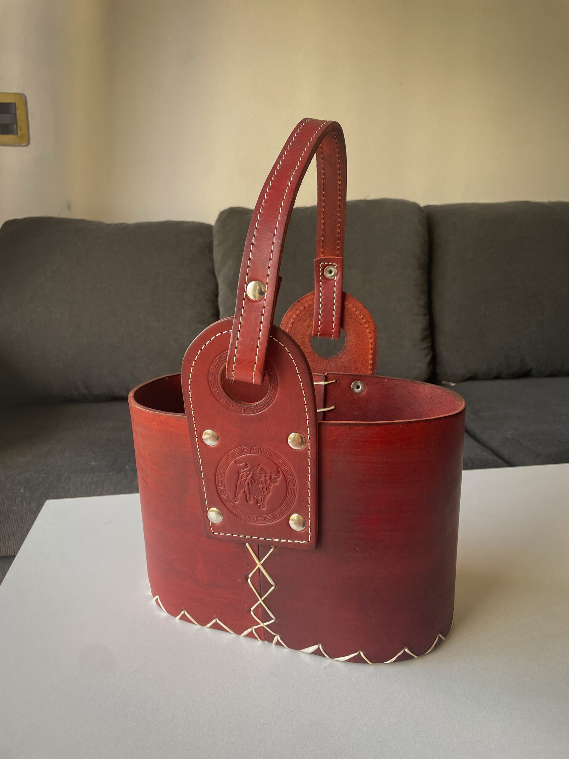 Media canasta de cuero 100% premium, con costuras en hilo tiento y terminaciones cinceladas. Compacta, reforzada y práctica para llevar tu equipo matero con estilo.