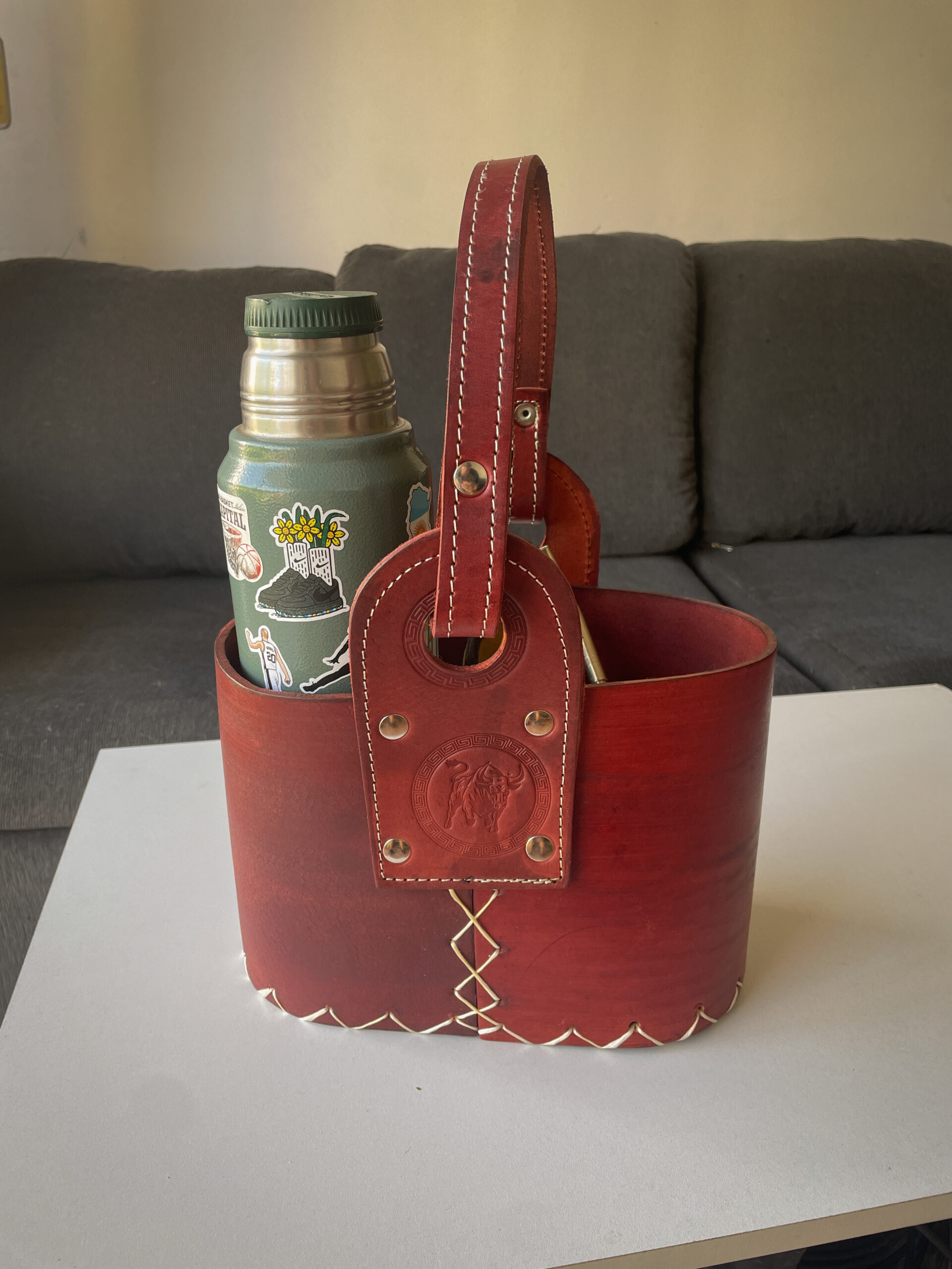 La Media Canasta de cuero es el equilibrio justo entre elegancia y practicidad. Fabricada en cuero 100% premium, reforzada y cosida a mano con hilo tiento, ofrece una estructura firme y resistente al uso diario. Su diseño compacto incluye un separador interior que permite organizar perfectamente el mate, la bombilla y el yerbero, manteniendo todo en su lugar.